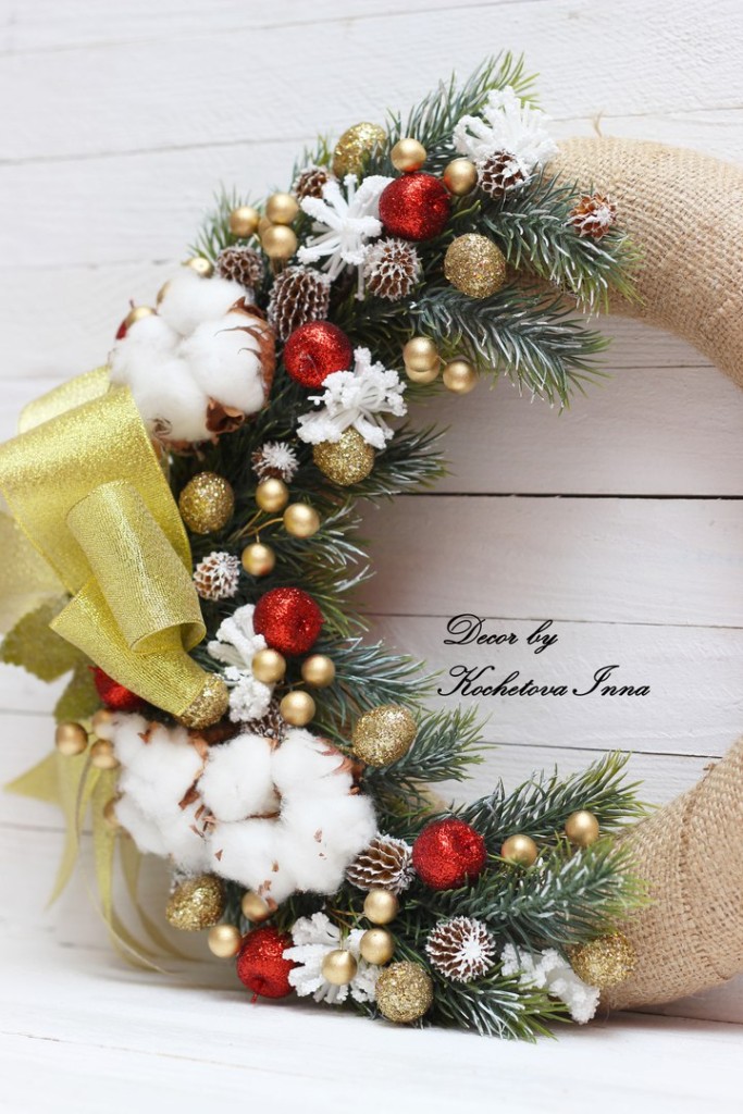 Декоративный рождественский венок . Панель идей 10 лет назад Декоративный рождественский венок .Мешковина ,хлопок ,шишки ,веточки ели ,золото.