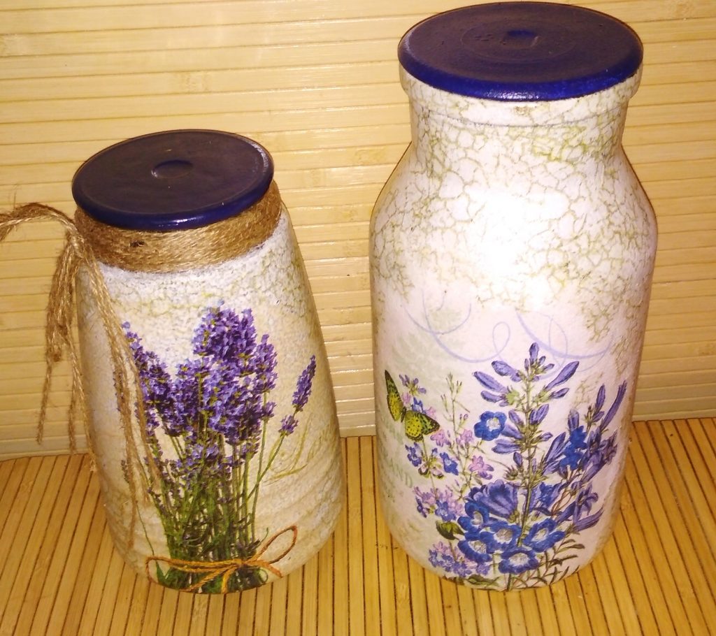 3. Декупаж банок салфетками закончен, осталось ее еще немного декорировать и покрасить крышку. Я использовала стеклянные старинные крышки, покрасив их акриловой краской фиолетового цвета в тон рисунку. Найти такие же сложно, поэтому их можно заменить обычными железными.