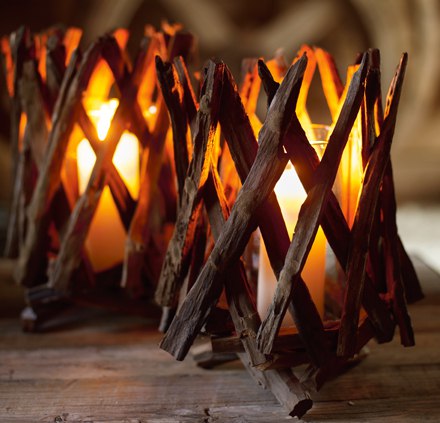 Как сделать из пары веток необычную композицию со свечами? Возьмите устойчивую деревянную подставку. Можно использовать готовое изделие, а можно просто снять со свежего пня при помощи пилы слой в 1-2 см, получив аккуратный «блин». Непосредственно для подсвечников понадобятся ветки толщиной чуть шире свечей, которыми вы собираетесь дополнить композицию. Чем более кривые и сучковатые будут ветки, тем интереснее получится результат.