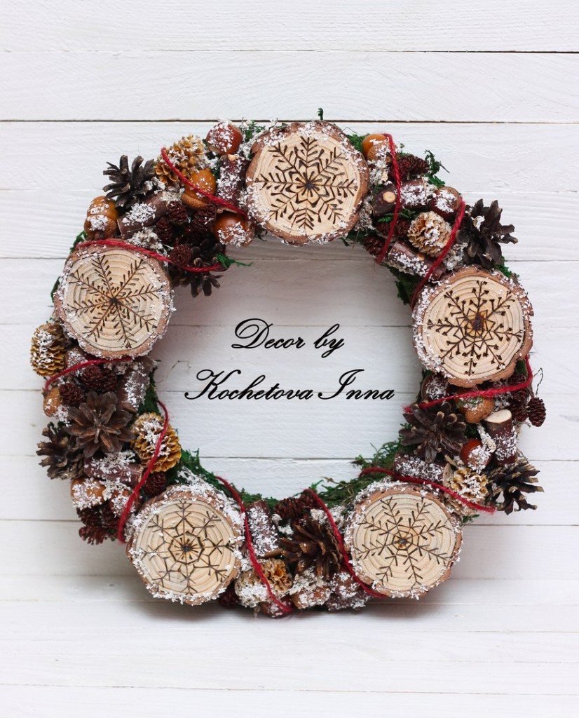 Рожественский венок декорирован мхом ,спилами с выжженными вручную снежинками ,шишками ,ветками ,желудями Панель идей 10 лет назад Рожественский венок декорирован мхом ,спилами с выжженными вручную снежинками ,шишками ,ветками ,желудями .лесными орехами.