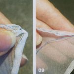 Затем иглой захватить 1-2 нити ткани основной детали, проколоть «кант» захватывая иглой 1-2 нити и т.д. (рис. 06, 07). При этом строчка смещается внутрь относительно внутреннего края «канта» на 1—2 мм. Удалить строчки заметывания, аккуратно потянув за оставленный конец нитки. Сначала удаляется внешняя строчка заметывания, после чего — внутренняя строчка. Перевернуть ленту нижним краем вверх и подогнуть внутрь правый угол ленты на 0,3 см по направлению вверх (рис. 08).