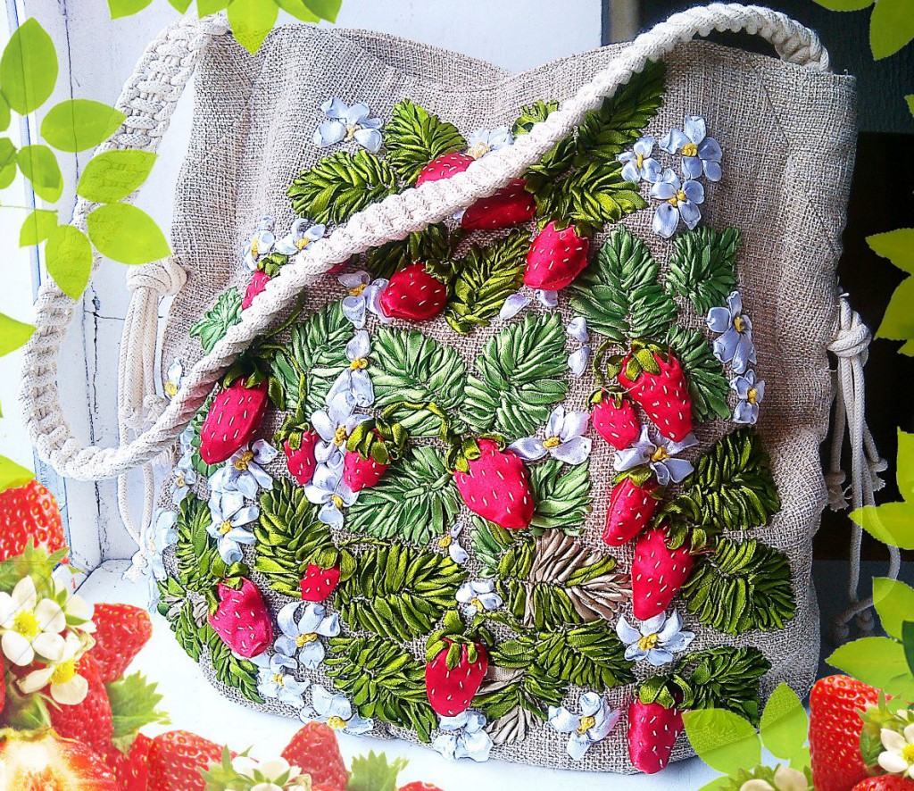 Вышитая сумочка из атласных лент Спелая Клубника Панель идей 10 лет назад Вышитая сумочка из атласных лент Спелая Клубника